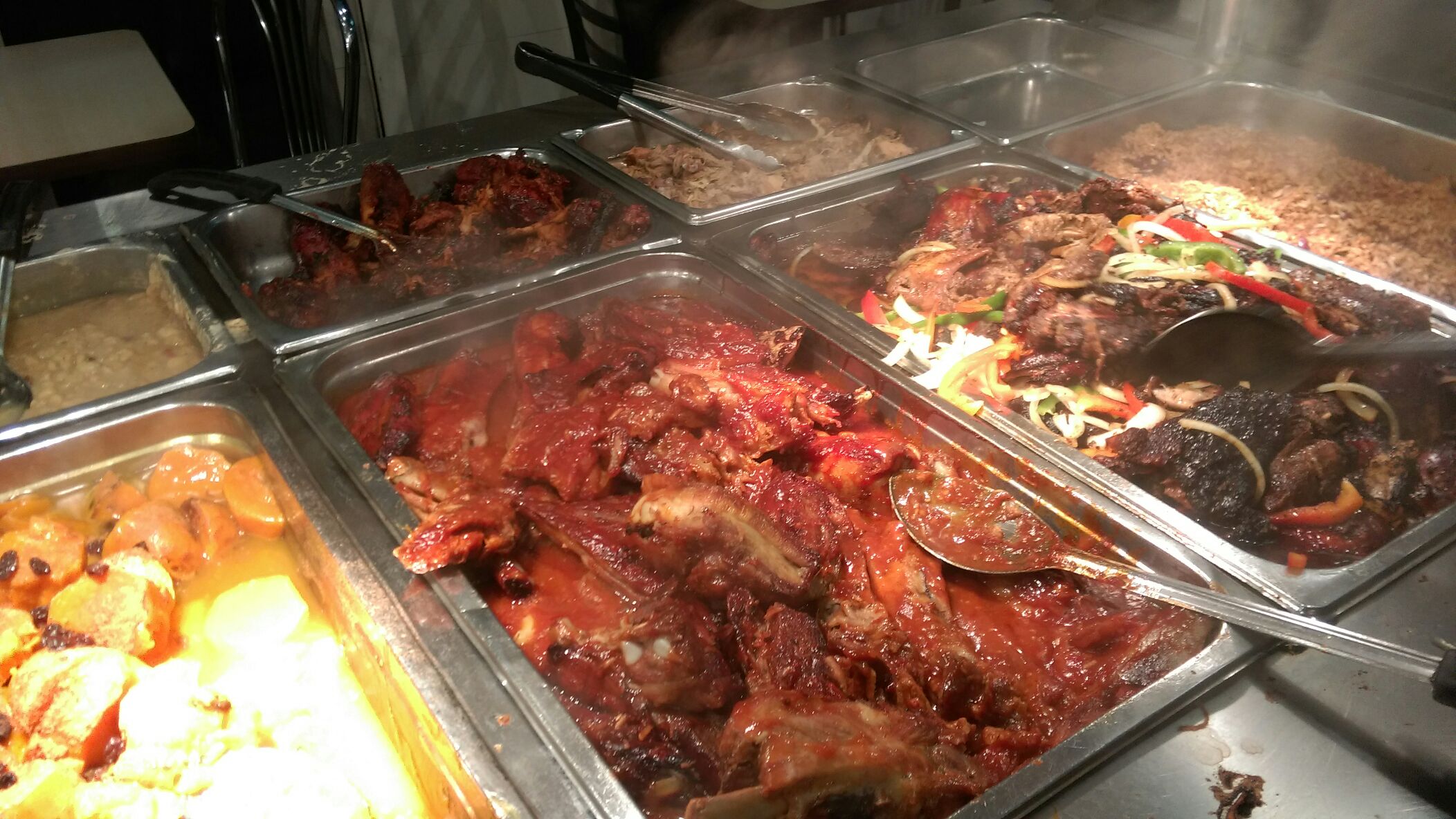 地下鉄を乗り継ぎハーレム{黒人街}へ、大きな店内の手前半分にお惣菜が並び、上段に有る容器に好きな物を入れ、レジで計りに載せて重さで料金を払うと、ホークとナイフをお盆に載せて、店の奥のテーブルに運んで食べます。